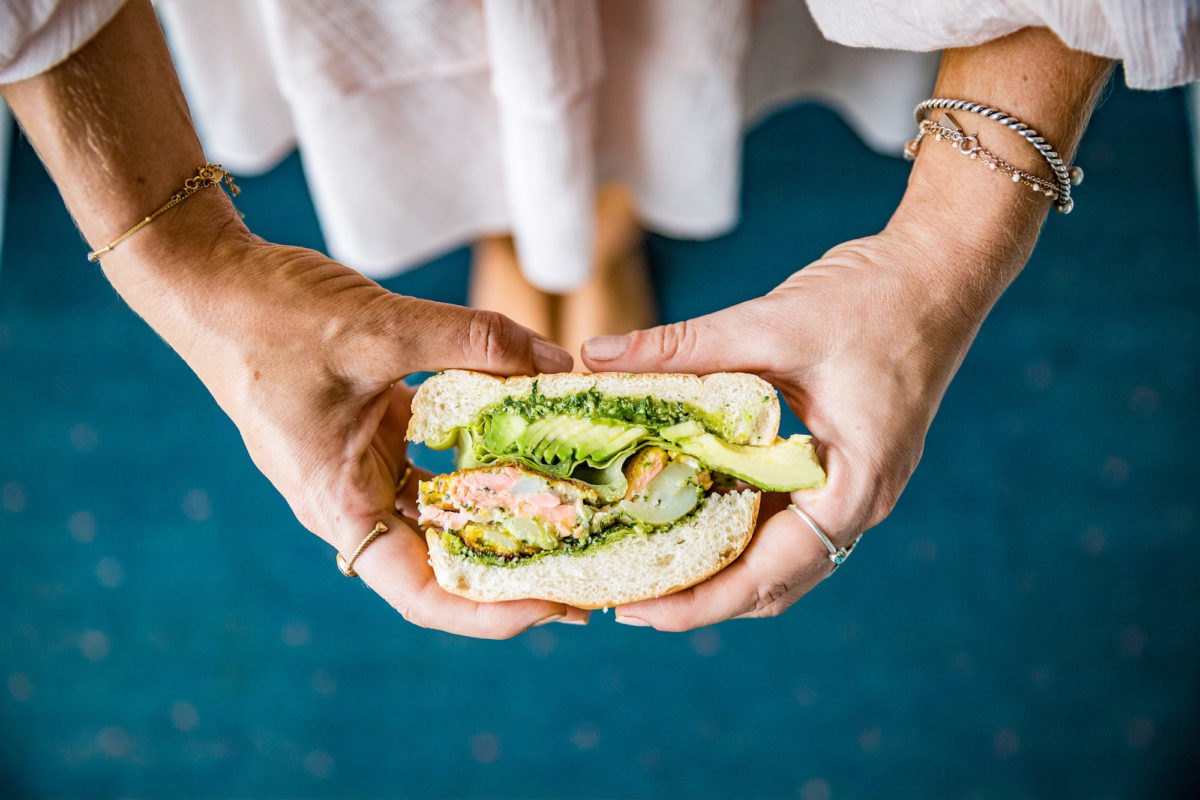 We’ve served our pesto on gluten-free, vegan, sprouted toast with some perfectly ripe avocados, cut into cool shapes.