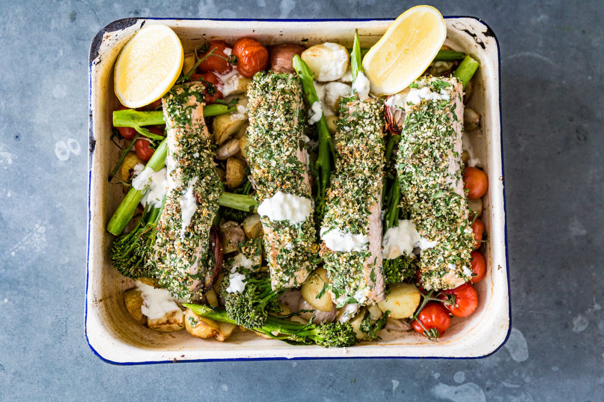 1. Preheat the oven to 200C (400F).In a tray add potato, garlic, chili, salt, pepper and olive oil, toss and roast until tender, (5 minutes)Add the chopped herbs, hemp seeds, lemon rind, lime rind, salt, and pepper on your chopping board and mix well.Roll your salmon in the herb mix then set asideOnce your salmon is done remove your baking potatoes from the oven. In the same tray add your tender ingredients – broccolini, tomato and zucchiniTop your veggies with your herb rolled salmon and then place the tray back in the oven. Bake for 5-7 minutes or until your salmon is cooked and flakey.Top with some yogurt, serve with some lemon and enjoy!